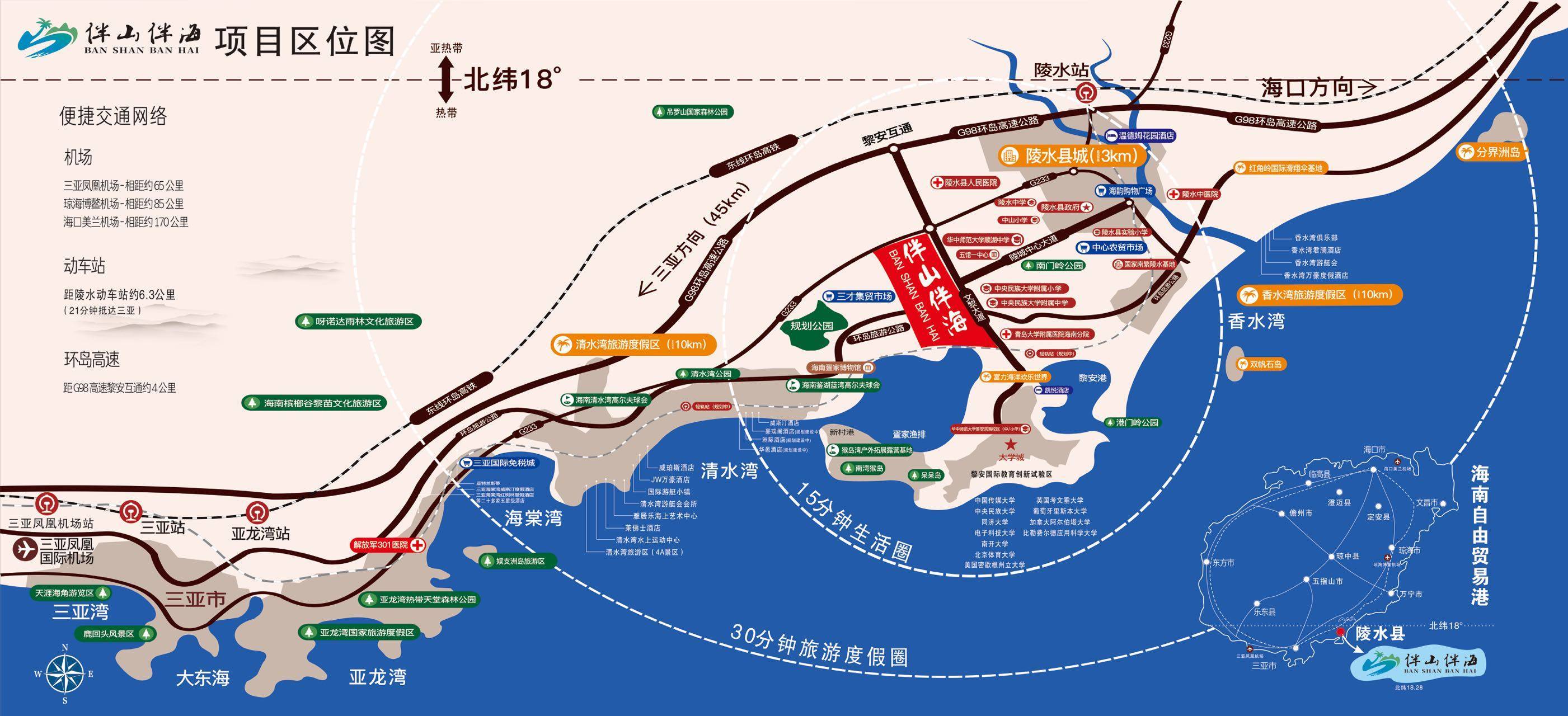项目位于北纬18°黄金海岸,坐拥于清水湾旅逛度假区、陵水县老城区和黎安国际教育立异试验区三区交汇的焦点。