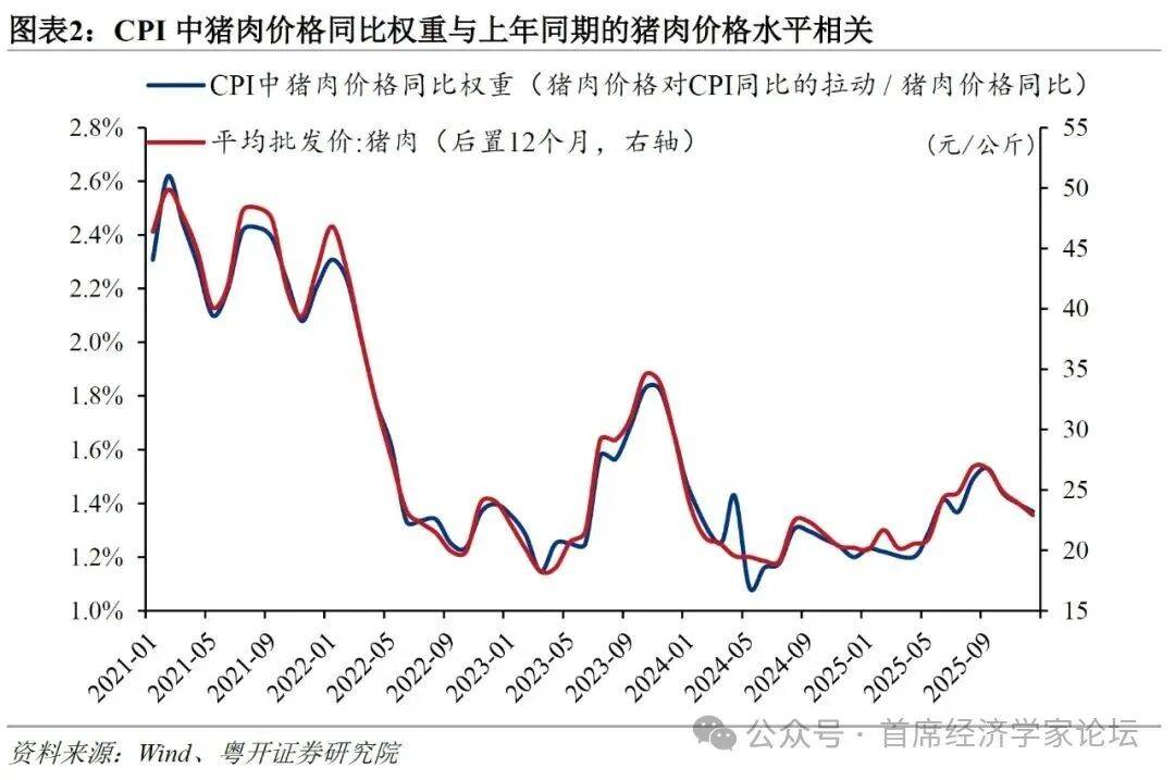 其次,“一月一小调”是由于各月的CPI同比或环比权沉遭到商品或办事价钱的影响。CPI各分项的权沉等于采办固定篮子中各类商品或办事的收入占采办整个篮子所需收入的比沉。固定篮子中各分项的数量是固定的,但价钱是时辰变化的,因而五年内各月的权沉将取决于各分项的价钱程度。具体来看,CPI同比权沉受客岁同期价钱程度影响,环比权沉受上月价钱程度影响,同比权沉畅后环比权沉11个月。例如,2021—2025年,CPI中猪肉的同比权沉取畅后12期的猪肉价钱程度相分歧。